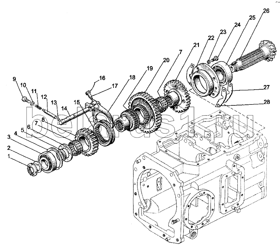 Каталог запасных частей к технике: МТЗ 1220.5. Вал вторичный (16F+8R)