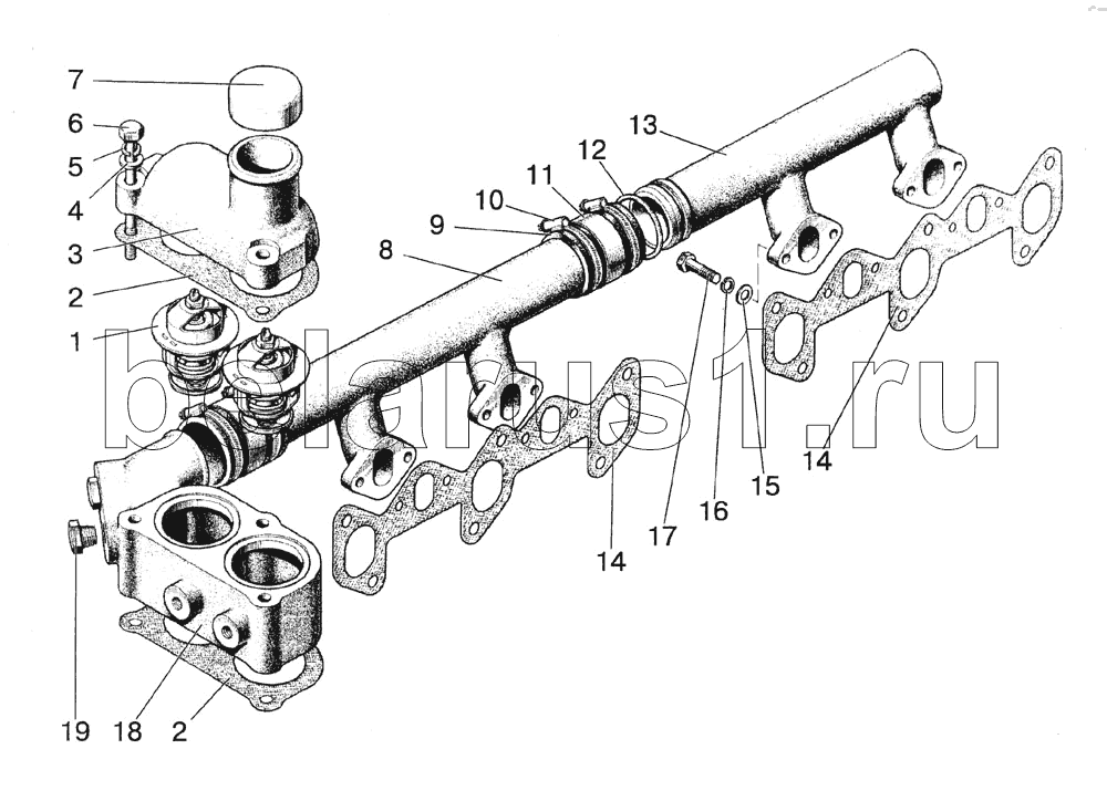 Каталог запасных частей к технике: МТЗ-1523. Труба водосборная и термостаты